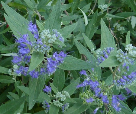This is one of my very favourite autumn flowers because it has the most beautiful form and colour, with a profusion of wispy blue, fringed petals and long elegant stamens running along the stems: the caryopteris.