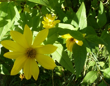 Pale yellow daisy petals of this helianthus shine out in the early autumn sunshine.