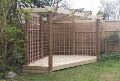• The ground is not level - high at the left corner sloping some 11 inches across the width of the pergola. Decking was the solution to getting a level base.